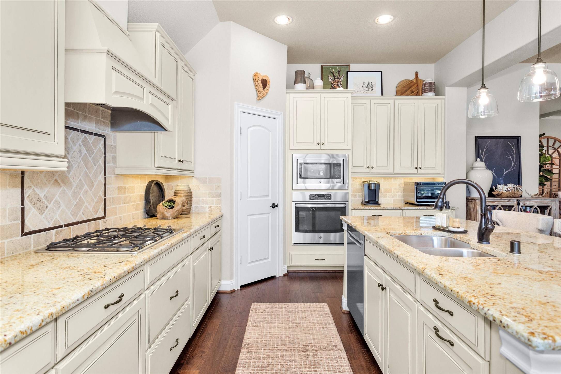Welcome to this beautifully appointed, one-of-a-kind 1 story home in the highly sought-after Laurel Park community. With impeccable design, this Hill Country inspired home perfectly balances comfort, style & modern functionality. Light-filled, open-concept layout boasts high ceilings, custom finishes with warm hardwood floors throughout. The gourmet kitchen features granite countertops, travertine backsplash, a large island & ample storage. The primary suite offers an extended bay window & a luxurious ensuite features dual vanities, a soaking tub, vanity & a huge walk-in shower! Includes a flexspace that can be used as private study or TV/gameroom. 3 additional bedrooms provides plenty of space for family & guests. The real showstopper is the beautiful backyard featuring lush landscape, sparkling pool, covered patio & separate sitting area with fireplace-ideal for relaxing or entertaining during those warm Texas days & chilly nights. Near shops, restaurants & zoned to KleinISD!